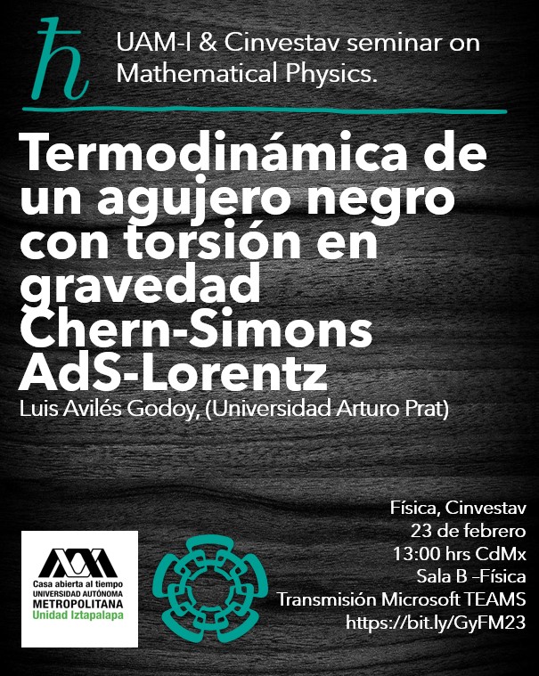 Gravedad Chern-Simons AdS en tres dimensiones puede ser extendida a gravedad AdS-Lorentz a través de un procedimiento de expansión del álgebra so(2,2). Esto implica la introducción de un campo dinámico extra en la teoría, el cual resulta ser la contorsión del espacio-tiempo. En este seminario se presentará una solución de agujero negro con torsión no nula en este contexto, se mostrará la estructura asintótica asociada a dicha configuración y se discutirá cómo la torsión modifica las propiedades termodinámicas del agujero negro.